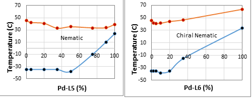 We also studied ternary phase diagrams consisting of mono-ligand Pd-L2/HL2 (62/37) eutectic mixture with Pd-L5 and Pd-L6, where the results are presented in Figure 4. With regards to Pd-L2/HL2 / Pd-L5 phase diagram, the predominantly linear trend of TIN transitions confirms the nematic miscibility of the components. Also this mixture exhibits an additional small eutectic point around Pd-L5=50 % at TNC = -40°C and provides a nematic stability range of around 73°C. Also according to Figure-4, the ternary Pd-HL2/HL2 / Pd-L6 phase diagram exhibits a chiral nematic (cholesteric) mesophase and total miscibility within the whole composition range manifested by linear trend of their TIN* transition temperatures. This mixture also exhibits a small eutectic point at the composition of around Pd-L6=10% and a mesomorphic stability range of around 79°C at TN*C = -38°C. The occurrence of eutectic point in these ternary MOM mixtures at different compositions means that, the crystalline structure of Pd-L2 is more similar to Pd-L5 than Pd-L6.