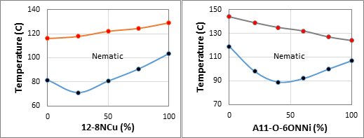 With respect to the bi-ligand MOM mixtures, in Figure 5 we present the binary phase diagrams of 12-8NCu/A6O-8NCu and A11O-6ONNi/A11O-6ONPd mixtures. It should be noted that, while the former phase diagram consists of the same metal (Cu) and different ligands, whereas the latter phase diagram consists of the same ligand and different metals (Ni & Pd). The linear trends of TIN transitions within the whole composition range of both phase diagrams (Figure 5) is the clear indication of complete mesogenic miscibility of these MOMs as well. Also both MOM mixtures exhibit strong eutectic behavior with the lowest nematic-crystal (TNC) transitions and largest nematic stability range. The eutectic composition of 12-8NCu/A6O-8NCu mixrures appears at around 12-8NCu=25 % with a nematic phase expansion of around 46.5 °C. The eutectic point of A11O-6ONNi/A11O-6ONPd phase diagram occurs at around A11O-6ONNi=40 % and similar nematic phase expansion of around 46.0 °C. Although both phase diagrams (Figure 5) exhibit the same nematic expansion range, but the eutectic composition in A11O-6ONNi/A11O-6ONPd mixture indicates its more crystalline structure similarity of their components with respect to those in 12-8NCu/A6O-8NCu. Such difference means that MOM mixtures with the same ligand and different metal have more similar crystalline structure than those with the same metal and different ligand.