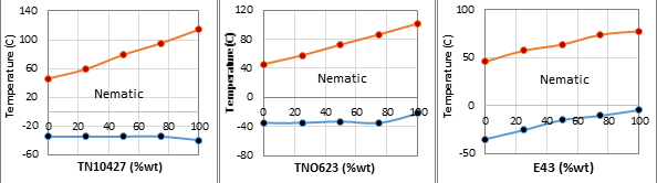 With regards to MOMs and commercial NLC model mixtures, in Figure 6, we provide the phase diagrams of eutectic Pd-L2/HL2 with three commercial TN10427, TNO623 and E43 materials. According to these phase diagrams, we find a complete nematic miscibility due to consistent linear trends of their TIN transitions within the whole composition ranges of three commercial NLC systems. It is also noticed that, the TNC transitions of this mixtures exhibit the linear trends with no ulterior eutectic behavior. Ideally, the nematic stability of such model guest-host systems depends on the nature of MOM and commercial NLC structures, as well as the extent of their TIN range.