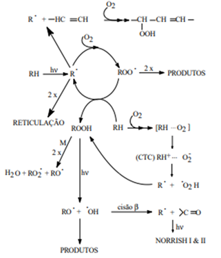 As plastic is a compound made up of long-chain polymers, they are subject to failures between monomers, these failures mainly in polyethylene terephthalate (PET) packages are predisposed to the phenomenon of ablation in their tapes, in the meantime Zhou et al.18 contribute to the discussion raised here, showing that the thermo-oxygen degradation process can significantly help in solving these 'Failures' that occur in (PET) tapes, improving the resistance of the material, reducing capital costs, whether economic or environmental. What can be seen from these studies is that the process of oxidative degradation is similar to plastics, it forms secondary compounds due to the chemical structure of the plastic, it is a low-cost process that can occur with or without the incidence of UV light, but always related directly the partial pressures suffered by the object, in the presence or not of low-cost metallic catalysts, but always with low biodegradability. The role of oxidative degradation in different studies and scientific Kotha et al.19–23 showing its capacity for electronic suppression of carbon molecules, the orbitals formed close to the spinel of the metallic catalyst, and its methodological advances in the treatment of groundwater through advanced oxidative processes (AOPs), in pharmacology, in metallurgy, showing its relevance through the aforementioned studies.