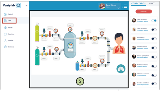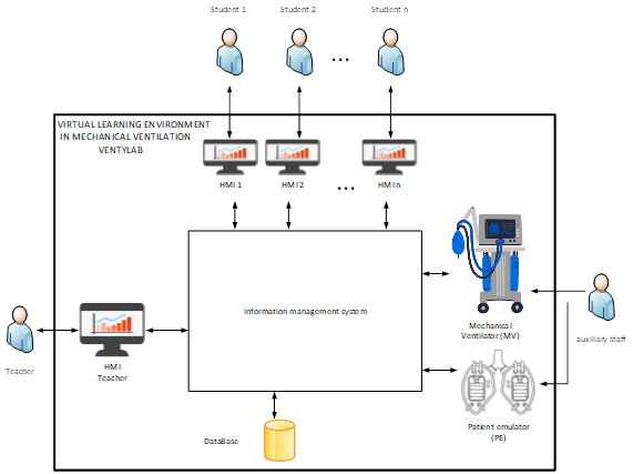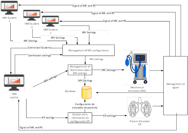 For its part, the students can observe the practices individually through their interface, since each one can log in from their personal computer. Moreover, each student remains in a passive state until the professor allows manipulation permits for the physical equipment (ventilator and patient emulators), at that moment the student interface is enabled and has the option to enter a new configuration for the mechanical ventilator.