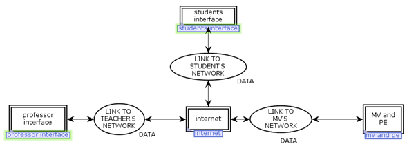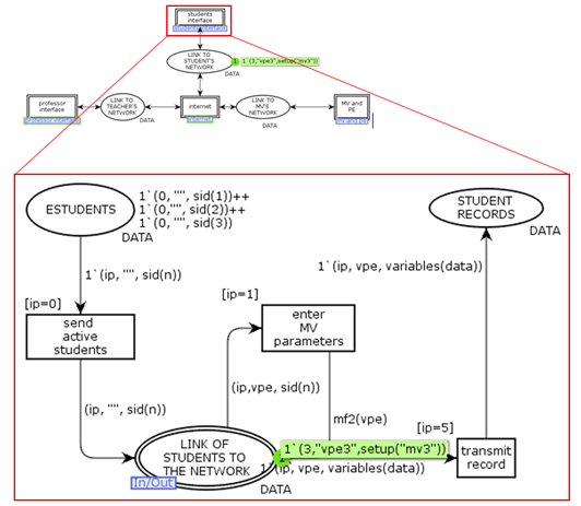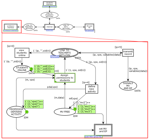 The macro transition named “professor interface” contains the subnet that represents the professor workstation, which allows the teacher to see the students logged in and assign them permissions to control the equipment. Each setting of the devices is made by one person at a time (student and professor)