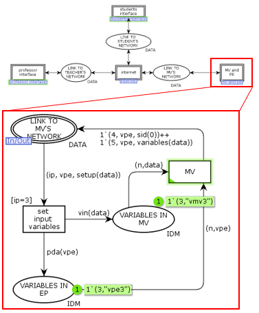 The model consists of three principal transitions (double-lined rectangles) which contain subnets defined as Professor interface, internet, MV and PE, and students interface.