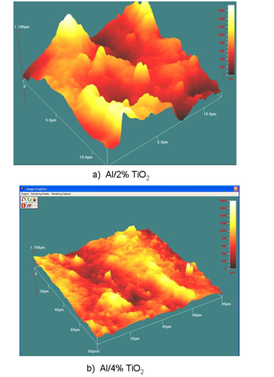 The results of the mechanical properties testing shown that all coatings, obtained with both nanoparticles, exhibited very high flexibility. The obtained value of flexibility was 2cm for all studied systems, without crack registered on the nanocomposite coatings due to the characteristics of alkyd resin. Both nanoparticles have higher aspect ratio which could contribute in the higher strength and mechanical resistance of the prepared nanocomposite coatings. The obtained data from the nanoidentation testing for the surface roughness and the hardness as well as the Young’s modulus are presented on Table 3. Nanoidentation data have shown that for both types of nanoparticles, the roughness of the obtained nanocomposite coatings remarkably increased, while the hardness decreased by increasing the nanopaticle content. Comparing the effect of the nanoparticle type, higher values for the hardness and the Young’s modulus were obtained in the nanocomposite coatings filled with TiO2 nanoparticles (Table 3). Characteristic AFM surface profiles for the studied nanocomposite coatings are shown in Figure 1 –for Alkyd/TiO2 system and Figure 2 for Alkyd/SiO2 system. These images confirmed that the addition of both nanoparticles increased the roughness of the surface. This indicates that nanocomposite coatings with higher amount of nanoparticles, specially TiO2, should have increased surface area resulting in enhanced adhesion13 (Figure 1 & 2). The abrasion resistance of the solid body is defined as its ability to withstand the progressive removal of materials from its surface as a result of mechanical action of a rubbing, scraping or erosion.6 Namely, the abrasion reduces the serviceability of the affected body and low abrasion resistance is a very important drawback that modern nanocoatings must overcome. The abrasion resistance of the nanocomposite coatings has been studied to evaluate if the presence of inorganic particles such as SiO2 and TiO2 could improve also the scratch resistance of the neat alkyd resin. Results for the abrasion resistance of the fabricated nanocomposite coatings are presented in Table 4. Better abrasion resistance was registered for the nanocomposites filled with SiO2 compared to nanocomposites with TiO2, for the mass changes after the certain number of cycles, (Dm 2%SiO2=0,0136g; SiO2 Dm 2%TiO2=0,0521g). According to the literature, this finding could be attributed to the fact that the nanoparticles support part of the applied load, thus the penetration into the polymer surface is reduced and only micro plugging and/or micro cutting phenomena can be generated, as can be seen in Figure 3B & Figure 4B (Table 4).