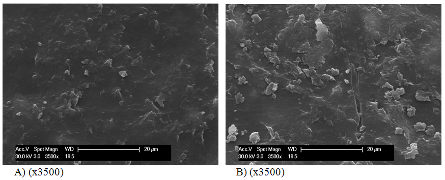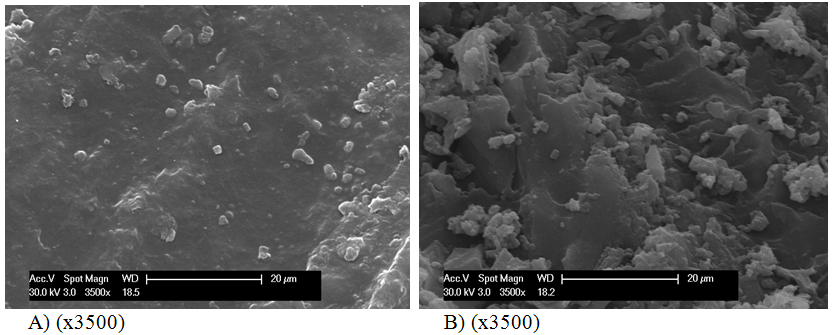 Morphology changes before and after abrasion test measurements were followed by SEM. The obtained microphotographs for Alkyd/SiO2 nanocomposite coatings are shown on Figure 3A, while for the system Alkyd/TiO2 nanocomposites coatings, are shown on Fig. 4a. The resulting abrasion marks and surface micro ploughing effects were registered for both investigated systems (Figure 3B & Figure 4B). Under the attack of the rough abrasive paper, the grains penetrated deeply into the surface of the polymer, removing materials from the surface by extensive micro ploughing process. During this phase, the polymer matrix is highly plastically deformed due to the micro cutting and wear debris was formed.