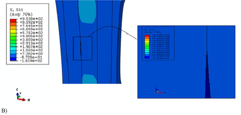 Figure 1B shows the distribution of circumferential stresses by these forces, in the near vicinity of the cracking front. It is observed that these mechanical stresses are important at the tip of the crack. Analyzes show that the increase in crack length and applied load has the effect of increasing the growth of these stresses.