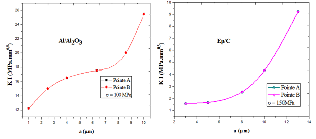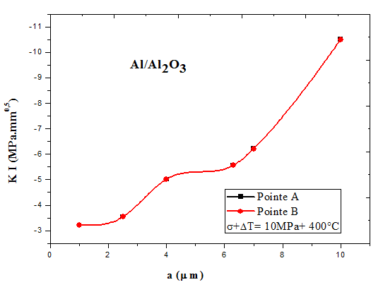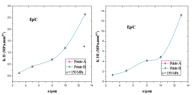 In mode III, the values of the stress intensity factor are comparable to those of mode II (Figure 6). This mode of rupture is all the more marked as the size of the crack is more favored. Our results clearly show that a crack initiated at the fiber-matrix interface propagates, under the effect of the internal stresses induced in the fiber and the matrix, in mixed modes (modes II and III). This propagation is all the more unstable as this composite is subjected to high temperatures.