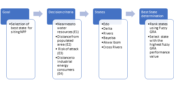 Figure 1 depicts the proposed method for determining which of Nigeria's six south-south states is the best location for a nuclear plant (NPP). As shown, the next step is to establish criteria for evaluating each state's performance after determining the goal of locating the NPP in the best possible state. Here, in Table 1 are the criteria that we used to make our final decision. The states are ranked using the Fuzzy GRA technique, and the state with the highest fuzzy GRA performance values is chosen.