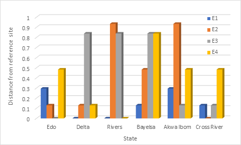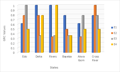 Figure 4 shows how GRG can be determined using Equation (9). Delta, Cross River, Rivers, Edo, Bayelsa and Akwa Ibom are the alternate NPP locations shown in Figure 3. Because Delta state having the highest GRG score is the best site for NPP location.
