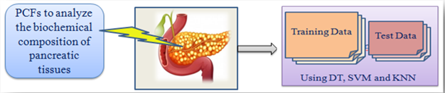 To train AI algorithms for the diagnosis of pancreatic cancer we have used supervised learning. In supervised learning, the algorithm is trained on a large dataset of labeled examples, with each example consisting of a PCF spectral signature and an associated label indicating whether the tissue sample is cancerous or non-cancerous. The algorithm learns to identify the patterns and features in the spectral signature that is indicative of cancer, allowing it to accurately diagnose new tissue samples. By accurately identifying the unique biochemical signature of cancerous tissue, these algorithms (DT, SVM, KNN) improves the accuracy and efficiency of diagnosis, leading to better outcomes.
