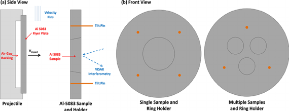 Dynamic loading experiments under extreme testing conditions yield much different mechanical and chemical responses in materials when compared to those found under static conditions. Engineering applications of shock physics including ballistic and explosive impact, as well as any other sort of high energy collision, are found in a range of industries such as armor and weapons. The extreme temperatures and pressures at which shock physics experiments are able to test can simulate the response of radioactive materials during the detonation of nuclear weapons. It is therefore critically important to these industries to have an understand of the plastic response of materials at high temperatures and strain rates. An understanding of material responses is especially important for applications whereby shear bands are generated under extreme high strain rate conditions, such as in automotive and aerospace structures.1‒4 The foregoing serves as the motivation to investigate the appropriate experimental techniques that test the material responses to these conditions. One of the most common methods of investigating the behavior of materials subjected to a continuous deformation at high strain rates on the order of 105-107s-1 is to perform shear plate impact experiments.5‒7 In a general plate impact experiment, a gas gun launches a plate projectile towards a thin, circular specimen sandwiched between two additional plates.8 The flyer plate lies in between the projectile and the specimen, while the anvil plate lies behind the specimen. Often, the flyer plate itself is used as the projectile, making direct contact with the specimen. The projectile is guided by a key running through a keyway within the gas gun barrel, keeping it from rotating. A typical schematic of an experiment is depicted in Figure 1.