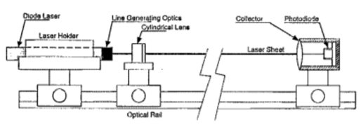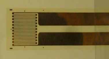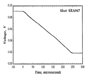 At impact, a pressure wave and shear wave are propagated into the flyer and the anvil plates. At this stage, the loading goes beyond the yield limit and the specimen experiences a plastic an nonrecoverable plastic deformation of approximately 2% due to the pressure wave.8 The pressure wave causes a force at the specimen-tungsten plate interfaces that provides sufficient friction to keep the specimen from slipping as it is loaded by the shear wave. Once the pressure wave reflects off of the far end of the rear tungsten plate and reflects back to reach the specimen, unloading occurs and the shear wave can no longer be transmitted through the specimen.8 In many experiments, the angle of each of the plates are adjusted uniformly with respect to the axis of the gas gun such that both normal and shear components of the pressure wave are created. The plates remain parallel to each other in order to maintain a uniform impact. Doing this allows researchers to study the response to different loading directions of the material in question.9 Of interest for applications involving shock-loaded materials is the Hugoniot elastic limit (HEL). The HEL is the pressure at which a material transitions from a purely elastic state to an elastic-plastic state. Above this limit, the material begins to act as a fluid, and loses much of its shear strength. Often, the stress-particle velocity curve of the specimen will show an abrupt drop at the HEL, attributed to a phase transformation within the material. The relationship between specific volume and pressure within a material above and below its HEL, called the Hugoniot curve, is shown in Figure 2. While a specimen subjected to static compression would fail far below its HEL, shock physics testing allows researchers to study this material phenomenon.10,11 The material response to these tests are most commonly measured using manganin gauges, either within the specimen or on its surface. These gauges are of a manganin alloy, which is a piezoelectric material generally consisting of 84% Copper, 12% Manganese, and 4% Nickel.10 Contrary to strain gauges, manganin gauges do not function by a change in resistance corresponding directly to the strain seen within the specimen. Rather, the piezoelectric alloy creates an electrical signal as a response to the pressure that the specimen is subjected to. The gauges are extremely thin, much like a foil, and are effective in measuring specimen stress in plate impact tests because of their low strain sensitivity and high-pressure sensitivity. A Wheatstone bridge measures and records the gauge output.10 A typical manganin gauge is depicted in Figure 3. Researchers proposed a novel pressure-shear plate impact experiment that consists of double-layer flyer configuration to analyze the dynamic response of metals undergoing high strain-rate testing.12,13 They concluded that the flow stress in metals is drastically increased as the test strain rate reaches a value of 105 s-1 and higher. It was also found that this increased sensitivity at high strain rates is due to an increase in strain hardening rate. Spall experiments are described in some detail later. Compressed nitrogen is used to accelerate a fiberglass projectile in the gun barrel. A reflective surface is created on the back of the anvil plate by placing an additional plate of polymethyl methacrylate there. This allows for the use of a laser interferometer, which takes velocity measurements of the anvil plate. Spall experiments test pure crystals of material that are embedded in a ductile binder alloy. Vogler & Clayton14 tested elongated spall at different crystal orientations within its binder. It was found that samples with the microstructure presenting the most area per unit volume in the direction parallel to the impact direction were stronger than those whose crystals were oriented perpendicularly.14,15 Ramesh and Kelkar at Johns Hopkins University16 developed a technique to measure the velocity of the projectile of a plate impact testing machine. As shown in Figure 4, the laser line velocity sensor system (LLVS) consists of an optical laser sheet generator, light collecting optics, and a holder. The motion of the projectile progressively allows diminishing light from the laser sheet to reach the photodiode of a collecting lens, onto which it is focused. The change in voltage over time due this change in the intensity of laser reacting with the photodiode can be used to calculate both projectile velocity and acceleration as a function of time. The output voltage response of a pressure-shear plate impact experiment on 6061-T6 aluminium samples is shown in Figure 5. The Nicolet 4049C digitizing oscilloscope is the source of the digital noise while taking the measurements. The accumulated light intensity on the collector is represented by the initial output, while the final output indicates the background intensity. Ramesh & Kelkar16 concluded that the LLVS is a cost-effective, accurate, and very efficient method of measuring the projectile acceleration. One difficulty in performing plate impact experiments is to achieve the high projectile velocities required without damaging the projectile itself, which is desired to remain within its elastic region throughout the test. Lemke et al.17 described method of achieving ultrahigh flyer plate velocities of 34km/s by means of magnetic acceleration. The current rise time was tailored to gain drive pressures of up to 490GPa on a 850 micron AL 6061 plate without inducing shock.