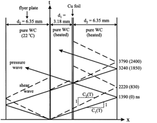 Another method of launching flyer plates on the scale of 0.5mm in diameter and 25-75μm thickness is by using a short, high energy laser pulse. Banishev et al.18 described a process of creating a nanosecond long high energy laser pulse in order to launch aluminum and copper flyer plates. A foil is positioned on the back of the flyer plate and becomes a rapidly expanding plasma upon being struck by the foil. The rapid expansion of the foil drives the flyer plate forward. A major concern of the laser propelled flyer plate method is after launch, the laser continues to act on the flyer plate, liquefying part of it throughout its motion. This causes the plate to lose mass, introducing high variability into the equations of state involving the conservation of momentum, and destroys the flyer plate during each test.18,19 Banishev’s group18 has constructed a flyer plate configuration that allows for it to be launched by the laser while at the same time shielding it from the laser pulse after it has been launched. Figure 6 shows the construction, which consists of the foil bonded to a borosilicate glass substrate by an epoxy layer. The laser is mostly absorbed locally at the glass/epoxy interface, denoted as the absorbing interface region. Shock is induced in this layer of the glass, aiding in propelling the flyer disks, while the entire glass substrate acts to allow only a small fraction of the incident pulse to be transmitted through it and onto the flyer plate. It was using this method gave the flyer plate the same flight characteristics as conventional methods.18,20 Frutschy and Clifton experimentally investigated the dynamic behavior of OFHC copper at high strain rates of 105-106s-1, and temperatures up to 700°C.21 The time-distance diagram of the experimental setup is illustrated in Figure 7. The specimen, which takes the shape of a thin foil, is placed under high-temperature tungsten carbide plates. It is important that these plates remain elastic at the high temperatures at which testing takes place. Any misalignment which may take place due to thermal expansion of components within the system are measured by the reflection of a laser off of the back end of the rear plate.