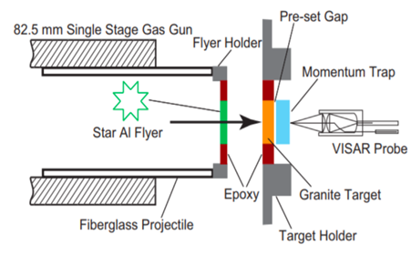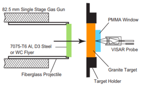 The misalignment is corrected using a remote control to orient the plates such that the correct alignment with the face of the projectile is achieved. An induction heating coil is wrapped around the specimen as shown in Figure 8, and the frame holder contains the ceramic holder that supports the specimen foil. To isolate the heating coil during the experiment, the coil is designed to be larger than the projectile tube. The results from Frutschy and Clifton’s experiments21 showed that the OFHC copper samples experience strain rate sensitivity of 2.5-14 x 105s-1 in a wide temperature range of 300-700°C. Yuan & Prakash22 developed a unique plate impact experiment to study the shock-induced response of granite rocks. Their experimental setup includes plate impact spall experiments (Figure 10), and soft recovery plate impact experiments (Figure 9). Soft recovery experiments allow the anvil plate to separate from the specimen once the pressure wave reaches its end in order to prevent the specimen from being reloaded after the incident pulse. This is desirable when the effect on the microstructure of the primary pressure wave alone is to be examined Results of Yuan and Prakash’s work show that the tensile fracture in granite samples is dependent on the duration of loading and that the tensile wavelength governs the maximum strength. Furthermore, they observed the growth of cracks and holes on the spall plane at higher magnifications. The cracks are initiated at weak grain boundaries and continue to propagate, causing brittle failure of the samples.
