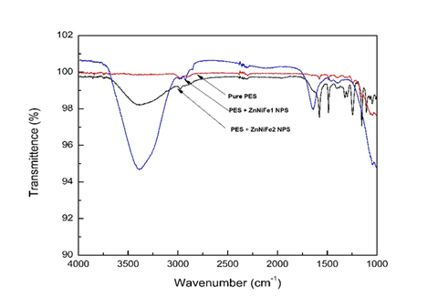 is shown in Figure 2. The –OH stretching vibrations appeared at 3527 cm-1 and 3366 cm-1 for the nanoparticle-reinforced thin films, and at 3174 cm-1 for pure polyethersulfone (PES). The C-H stretching and bending vibrations were observed at 2663 cm-1, 2584 cm-1, 2482 cm-1, 2417 cm-1, and 1588 cm-1, 1457 cm-1, and 1444 cm-1. We observed the -OH stretching band that arises due to the addition of ZnNiFe nanoparticles to disappear with a gradual increase in the percentage of nanoparticles in the chosen polymer PES (polyethersulfone). The regions of different wavelength peaks for the as-synthesized PES + ZnNiFe nanocomposites for different ratios of the nanoparticle reinforcements are summarized in Table 2.29