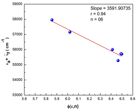 In an attempt to understand the solute-solvent interactions and charge transfer characteristics of the solute in different environments, the electronic dipole moments of fluorophore in a liquid medium were evaluated using the equations put forth by Bilot and Kawaski.17,18 These equations are: