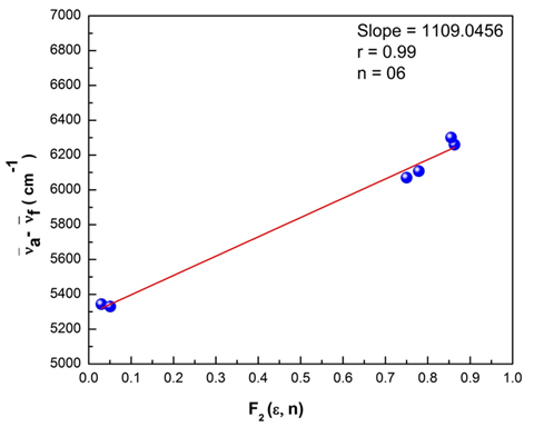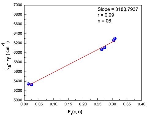 In these equations, n is the refractive index and ε represents dielectric constant of the solvent used. Further, m1, m2 and m3 are the slopes obtained by a linear fit of Equation (8), Equation (9) and Equation (10). The slope depends upon a change in the solute’s dipole moment upon excitation