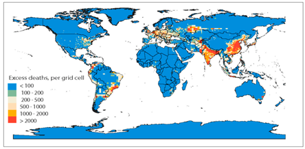 Figure 2 Estimated excess annual deaths due to exposure to surface PM2.5. Statistical data and image cited from Vohra et al.3