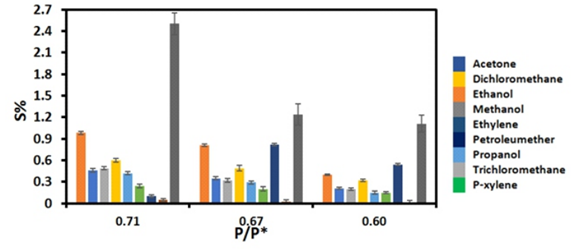 Mousavi et al.,34 reported using MIL-101(Cr), a highly porous metal-organic framework (MOF), for fabrication of resistive gas sensor for detection of low concentration volatile organic compounds (VOCs). The authors synthesized MIL-101(Cr)/CNT nanocomposite for sensing of methanol, ethanol, formaldehyde, isopropanol, acetone, tetrahydrofuran, acetonitrile, dichloromethane, and n-hexane at room temperature. Implementing MOFs leads to better sensing activity and higher gas molecules adsorption because of their large active surface area. Kheirabadi et al.,35 joined two similar Folded Armchair Graphene Nano ribbons (FAGNRs from their open sides, and constructed a new structure called Attached FAGNR tube (AFAGNT). The authors tested the gas sensing performances of CNT and AFAGNT in presence of CO, O2 and CO2 gases molecules, which resulted in significant sensitivities to CO gas molecule at various bias voltages, especially at 0.8V. Polyimidazole multi-walled carbon nanotubes (Plm/MWCNTs) nanocomposite films have been synthesized by Yahaya et al.,36 and tested against contrasting mixtures of gas. The proposed sensor provided fast response and recovery, high repeatability, and increased sensitivity for methanol, as it can be seen on Figure 5.
