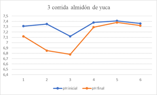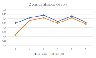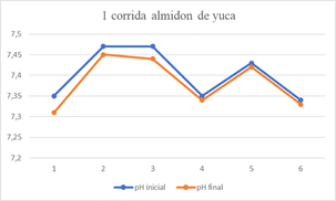 The pH range in which the cassava starch performed best was pH 7.12, showing that at low pH its performance and effectiveness is much more noticeable, being able to eliminate a BOD5 removal percentage of 78.69, COD whose removal percentage was 77.47 and iron with a percentage of 65.50; however, none of these values complies with the provisions of resolution 0631.