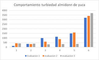 Graph 8 Behavior of turbidity due to the action of the cassava starch coagulant in the three evaluations.