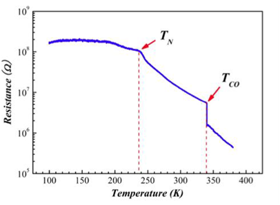 The electric property is reported in refs.18–19, 21, 24–28 The intrinsic electric property is also likely to be the same as that of bulk. The resistivity significantly differs depending on the stoichiometry. 1 Ωcm ~ 104 Ωcm of the resistivity is reported at room temperature. The higher resistivity indicates higher stoichiometry. As for the temperature dependence, the electric property shows anomaly around TN and three-dimensional charge-ordering temperature, TCO.21,24,26 Figure 5 shows the temperature dependence of resistance of the film.21 The discontinuous change and kink are observed at TCO and TN in R-T curve respectively. The same sample shows significant peak at TCO in the loss term of dielectric constant. However the magnitude of the anomalies depends on the sample. The sample in ref.26 shows anomaly only at TN in R-T curve. The sample in ref.24 shows anomaly only at TCO. Aside from the magnitude, these anomalies at TCO and TN indicate spin-charge coupling and the charge order as the key of the electric property. Although such anomalies are reported also in bulk, films show larger anomalies. It is important that the spin-charge coupling become prominent in film rather than be kept.