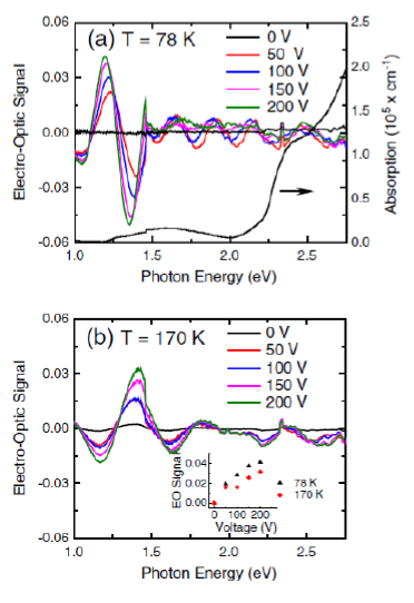 Figure 8 Electro-optical effects in applied dc voltages up to 200V, and the absorption coefficient of the LFO thin film in the photon energy range of 1–2.75 eV at (a) 78K and (b) 170K. The absorption spectrum in (a) shows the Fe2+ d to d on-site electronic transitions at ~1.60 and 2.40 eV, respectively. The observed electro-optical effects are stronger around the rising slope of the 1.60 eV peak and vary from +4% to −5% at 78K, and from +3.5 to −1.5% at 170K, respectively. The inset in (b) shows the electro-optical signal as a function of applied voltage at 78 and 170K.25