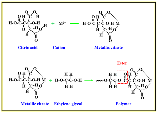 The PCP is a temperature synthesis route for nanomaterial oxides, also known as the amorphous complex method.2,14,16,27 The Pechini patent16 on making thin film capacitors by using multifunctional organic acids that can trap metal ions into stable complexes and a diol, which acts as a solvent during the complex formation step and then takes part in the polyesterification reaction to create a three-dimensional polymer network with mixed metal ions on the atomic scale.28–31 The schematic representation of the reaction scheme is shown below in Figure 1. Citric acid and ethylene glycol are best suited for the reaction. Citric acid is a relatively strong multifunctional organic acid. Its structure facilitates the formation of five or six-membered rings in the metallic citrate complexes, known as polymeric matrix or cavity. The chemical reaction hence takes place inside this matrix. The chemical reaction between ethylene glycol and citric acid takes place at room temperature, without applying thermal energy. It is well known that the boiling point of ethylene glycol is the lowest among all the diols. As a result, using ethylene glycol as a solvent and a monomer proved extremely convenient. Formation of metallic citrate complex and then its conversion into the polymeric precursor form,as shown in Figure 2. Polymeric citrate precursors were used to fabricating nanocrystalline solid solutions of Ba1-xSrxZrO3 and Ba1-xPbxZrO3 (0£ x £1).30,32