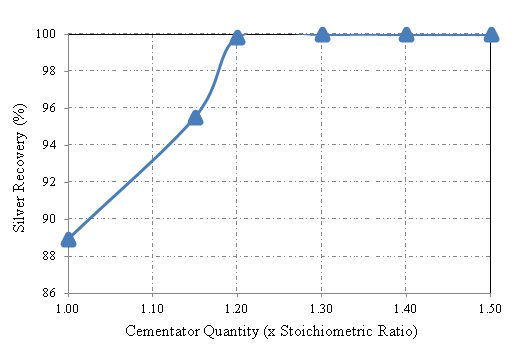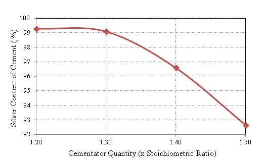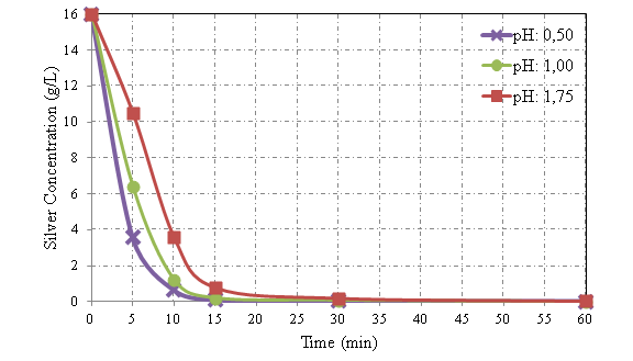 Leaching experiments were carried out at 50% HNO3 concentration, S/L ratio of 1/5, leaching time of 4 hours, and room temperature. Results showed that, silver leaching efficiency was above 99.8% and leach solution contained 16 g/L Ag+ and 8.5 g/L Cu2+ ions. Leach residue was characterized by XRF and contained 0.397% Cu and 0.113% Ag. In the cementation experiments the effects of cementator quantity (times x 1.0-1.5 stoichiometric ratio), stirring speed (no stirring, 120, 240, and 360rpm), pH (0.5, 1.0, 1.75) and temperature (25, 45, 65°C) on Ag cementation were investigated and the results are summarized below. Experiments of determining the optimum cementator amount were performed at pH 1.75 for four hours. The results are shown in Figure 5. Results have shown that a cementation yield of 99.5% was obtained in case of using 1.2 times the stoichiometrically required copper as a cementator. The resulting cement silvers were characterized by XRF and the results are shown in Figure 6. Silver recovery values seemed to be stable at around 99.5% when using more than 1.2 times the stoichiometrically required copper. On the other hand, gradually decreasing purities were observed with increasing cementator amounts. As a result of the experiments, the optimum cementator amount was determined to be 1.2 times of the stoichiometric ratio. Experiments were performed at room temperature and pH 1.75 to investigate the effect of stirring speed, which was chosen as 0, 120, 240, and 360rpm in the series of experiments where 1.2 times the stoichiometrically required amount of cementator was used. Dendritic silver crystals obtained in the experiment with no stirring are shown in Figure 7 and results are illustrated in Figure 8. Tests for determining the optimum pH were performed at room temperature and at 240rpm constant stirring speed. The results are shown in Figure 9. Effect of pH on cementation rate was dominant at the beginning of experiment and it didn’t chance much after 30 minutes of cementation. Effect of temperature on silver cementation is shown in Figure 10. Increasing temperature resulted in decreasing effect on cementation up to 60 minutes of time where they all reached to the same value.