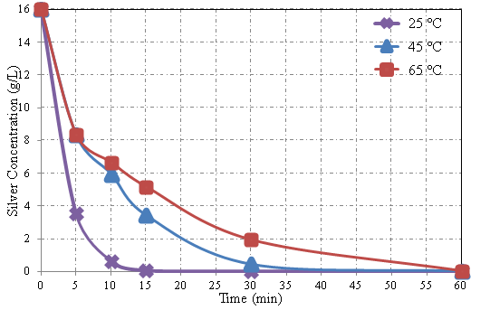 Pereira and her colleagues14 followed a similar process as Fung and Lee’s study of reduction with glucose. However, they used l-ascorbic acid and sucrose as reducing agent. In the study where sucrose was used, silver was recovered with the yield of 71.9% and the purity of 87.1%. On the other hand, in the study where l-ascorbic acid was used, silver was recovered with the yield of 84.4% and the purity of 91.1%.14 Cementation that will be used in this experimental study has been used to recover noble metals or heavy metal ions from solutions since 16th century.15 Cementation is based on a redox reaction between noble metal ion and relatively base metal. Cementation is an easy process to recover metal ions from solutions. Also, because of low cost, high efficiency and ease of applicability, it is a preferable method in hydrometallurgy. Metallic copper is commonly used for cementation of silver. The cementation reaction of silver with copper occurs as follows: