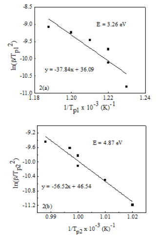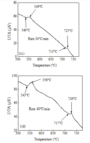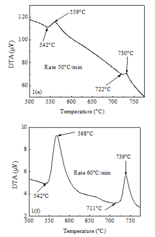 Figure 1A-1F represents the DTA traces of as-cast Fe73.5Nb3Cu1Si13.5B9 alloy from room temperature to 800oC with heating rates of 10–60oC/min at the step of 10oC. In each figure, two exothermic peaks are distinctly observed; corresponding to two different crystallization events initiated at temperature Tx1 and Tx2 respectively. Figure 1 reveals that the crystallization of each phase occurs over a wide range of temperatures and the peak temperature shifts to higher values with the increase of heating rate. In other word, more heat energy is required for the formation of crystalline phases with increasing heating rates. From each of the DTA traces, it is obvious that the area under the first crystallization peak is larger than the area covered by the second crystallization peak.
