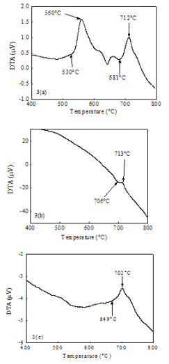 Figure 3 DTA traces of Fe72.5Cr1Nb3Cu1Si13.5B9 alloy at the heating rate of 20oC/min annealed at (A) 450oC (B) 550oC and (C) 600oC