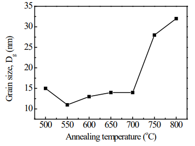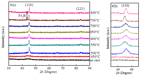XRD patterns for the Fe73.5Nb3Cu1Si13.5B9 alloy as as-cast state and annealed at temperature 450, 500, 550, 600, 650, 700, 750 and 800oC each for 30 minutes are presented in Figure 4A. It is evident that the XRD patterns for the samples at as-cast state and annealed below 500oC, i.e. at 450oC, exhibit only one broad peak around 2θ = 45oC, at the position of d110 reflection which is generally referred to as diffuse hallow, indicative of an amorphous phase. This suggests that at Ta<500oC, the alloy remains amorphous. So the onset crystallization temperature determined from these results is between 450-500oC. The crystallization onset temperatures from DTA experiment for different heating rates were found in the range of 513-543oC, which shows a good consistency with the XRD results. The value of FWHM for the sample annealed at 550oC is 0.8144. With increasing Ta beyond 550oC, the FWHM value is getting smaller. It confirms that the crystallization occurs to a good extent at the higher Ta. The XRD pattern illustrated in Figure 4(a) reveals that the both the position and broadness of the (110) diffraction peak vary as the annealing temperature increases. We observe a general increase in the intensity of the diffraction peak with the annealing temperature, consistent with an increase in the crystalline volume fraction. The existence of Fe2B phase is noticed in the XRD spectra when the sample annealed above 700oC which is in agreement with the crystallization temperature obtained by DTA curves. Li-xia Wen et al.34 also reported the similar result.34 The slight shift of peak towards the lower/higher angles with increasing Ta has been noticed in the XRD spectra as shown in Figure 4B. This may be related with stress i.e., when first crystallizes at ~500oC there is stress build up, with increasing annealing temperature the stress relaxes; then it comes to a second crystallization stage at ~700oC and stress builds up again. As a result, a change in the value of a0 as well as Si-content in the phase with increasing Ta are obtained. The values of FWHM, a0 , Dg, and Si-content are enlisted in Table 3. Figure 5 shows that in the Ta range of 500 to 700oC, the grain size remains in the range of 10 to 15nm, corresponding to a soft magnetic phase. Above 700oC grain grow rapidly and attain a maximum value of 32 nm at 800oC indicating the formation of the Fe2B phase. These results suggest that within the annealing temperature range of 500-700oC, the alloy maintain its nanocrystalline structure with a nominal grain size of <15nm. Hence in order to obtain the non acrystalline alloy with optimum soft magnetic properties annealing has to be carried out within this critical temperature.
