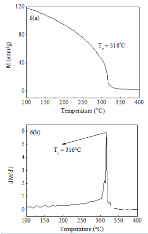 Figure 6A shows the variation of magnetization (M) of Fe73.5Nb3Cu1Si13.5B9 alloy in the as-cast state with temperature at constant magnetic field 800 kA/m. It is clearly observed that the magnetization (M) of the sample decreases gradually at low-temperature (<300oC) and falls faster nearer to the Tc of ~316oC. The Tc has been determined as the temperature corresponding to inflection point where the rate of change of M with respect to temperature is maximum shown in Figure 6B. As the temperature approaches Tc, M falls more rapidly near to zero as the thermal energy exceeds the magnetic ordering or the exchange energy. The sharp fall of M at Tc indicates that the material is quite homogeneous from the point of amorphousity. Our measured Tc of 316oC is similar to value reported for the original FINEMET without Cr.35