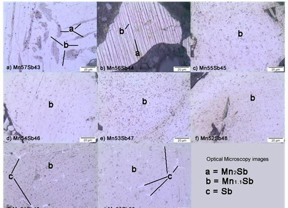 The images obtained from Optical Microscope (Figure 1), shows dark stripes (phase a) at Figure 1A Mn57Sb43 and Figure 1B Mn56Sb44, related to Mn2Sb phase, the clear phase (phase b) is attributed to Mn1, 1Sb phase which is dominant in all the samples. At Figure 1, the other samples showed are: c) Mn55Sb45, (d) Mn54Sb46, (e) Mn53Sb47, and (f) Mn52Sb48 basically with only one phase (Mn1,092Sb). In accord to EDS lectures the dark dots are reminiscent phase Mn2Sb or oxides. The images g) Mn51Sb49 and h) Mn50Sb50 shows an almost white phase, attributed do Sb. The phases were confirmed through EDS probe analysis.