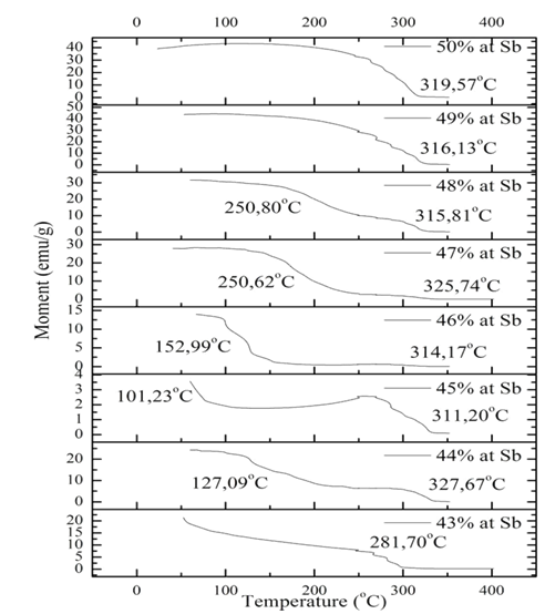 As the samples were analyzed on “as cast” state, only the heating curve were considered. The data collected were plotted at Origin® software and used the function derivative to determine the transitions temperatures. As the samples were not annealed, the metastable equilibrium was not reached, causing too much noise on magnetic measures. The curves were smoothed and the transition temperatures were defined through derivative function. The magnetic measured data from VSM (MxT) were summarized at Figure 2, it shows a Tc dependence of %at.Sb from 49% to 45%, regressing from 316 °C to 101°C. Two magnetic transitions were observed on samples from 48%at.Sb to 44%at.Sb, the first varying in accord to composition, attributed to Mn1.1Sb phase; the second one, a little above to 310°C, provides evidences there is a second phase. As the samples were not annealed, it is not possible to confirm if this second phase is because of metastable phases or if could be two phase region on phase diagram.