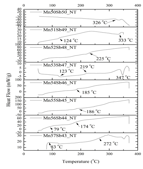 Also on DSC, the data was plotted, smoothed and derivated to reduce the impact of noise caused by metastable phases. Even though, the Mn50Sb50 presented only one transition, associated to the richest composition of Mn1.1Sb phase, indicated at phase diagrams3 as 314°C, but measured at 326°C. Only sample Mn57Sb43 presented a secondary transition close to expected transition of Mn2Sb phase (pointed at 277°C on Okamoto’s phase diagram,3 indicating only this sample would contain this phase. The other samples indicated there is a dependence of Tc in accord to composition, in most cases with at least two transitions temperature, but significantly different from VSM. The probably reason is the non homogeneization of the sample through annealing (Figure 3).