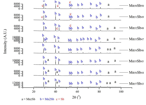 The X-ray diffraction (Figure 4) and Rietveld refinement at Topas® software, confirmed the 2θ angles related to “a=Mn1,1Sb (hexagonal P63mmc)”; “b=Mn2Sb (tetragonal P4nmm); and “c=Sb (rhombohedral Rm)”. All the samples presented predominance of Mn1, 1Sb. The alpha antimony, peak “c”, is only present at Mn52Sb48, Mn51Sb49 and Mn50Sb50 alloys, and is visible only at OM images Figure 1. (g) and (h) as “white phases”. Mn2Sb phase was identified in all the samples, although in low percentage (below 10.7%), going in opposition to mentioned phase diagrams.