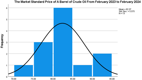 Figure 1 The market standard price of a barrel of crude oil from February 2023 to February 2024. Showed the mean of 82.4 for the actual market price of a barrel of oil, Std. Dev of 5.6 and no missing numbers.
