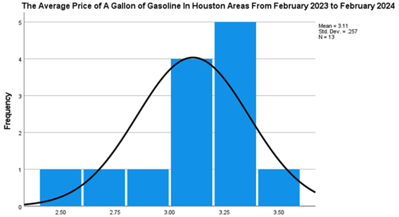 Figure 2 The average price of a gallon of gasoline in Houston areas from February 2023 to February 2024. Showed the mean of 3.11 for the average prices of a gallon of gasoline in Houston areas from February 2023 and 2024, with Std. Dev of .26 and no missing numbers.