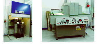 The PDLC film preparation with each formulation was carried out with Polymerization Induced Phase Separation (PIPS) method by UV radiation (UV-PIPS). The flexible PDLC films were prepared by a custom-made in-situ coating and lamination system of homogeneous mixture for each formulation consisting of NOA65 pre-polymer, liquid crystals at corresponding concentrations, 1% Irgacure819 and 0.2% plastic spacers versus total formulation where pre-heated at 30-80 °C temperatures for 10-30 minutes.7,8 The uncured homogenous PDLC formulations were mixed for three hours at above nematic-isotropic transition temperature and then were poured between the vertical gap of two heated vertical rolls of ITO-PET supports films on a custom-made plastic coater/laminator system shown in Figure 1. Immediately under the coating/laminating rolls, the uncured PDLC films were passed through a pressure roll to insure the uniformity of the film separated by plastic micro-spacers. The uncured PDLC films were then cut and transferred to a custom-built conveyor system (see Figure-1) and cured by a high-intensity UV lamp with corresponding radiation intensities at line speeds of 0.5 meter/minutes at relevant cure temperatures. The cure temperature was measured by a thermocouple during the curing process. The experiments were carried out on three PDLC samples for each formulation and the reported experimental results are the average values of three samples. The morphology of PDLC films, including the average micro-droplet dimension (<D>), number density per unit area (<N>) and droplet volume fraction (<a>), were measured from the areas of micrographs of both horizontal and fractured micrographs with a JOEL model JSM-6300 scanning electron microscope (SEM). Determination of <D> and <N> were carried out through direct two-dimensional image analysis of SEM micrographs of the samples. The PDLC layer thicknesses were also measured by both cross-sectional SEM micrographs and Mitutoyo-7007 specimeter. The resistivity r of TNO623 liquid crystal was measured at 1 Volt and 100 Hz frequency and their nematic-isotropic transition temperatures were measured under Leitz model Laborlux-12polarizing optical microscope equipped with Mettler model FP5microscopic hot-stage.