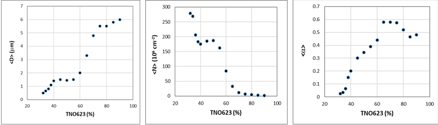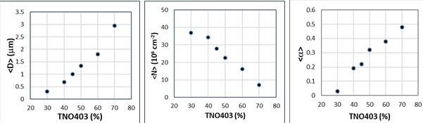 The PDLC samples with TNO403 were carried out at film thickness of 15mm, curing temperature of 50°C, UV curing intensity of 20mW/cm2 (EUV=2000mJ/cm2) at concentrations range of CLC=30-70%. In Table 2 & Figure 2, we present the CLC dependency of <D>, <N> and <α> in PDLC-TNO403 formulation. Also in Figure 3, we present the typical SEM micrographs of liquid crystal droplet sizes of <D>) in PDLC-TNO403 film formulations as a function of TNO403 concentration.