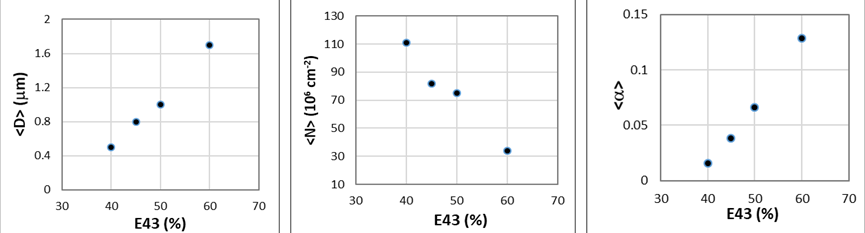 The PDLC formulation with E43 was carried out at a film thickness of 15μm, curing temperature of 30-80°C, UV curing intensity of 8-40mW/cm2 at concentration range of CLC=40-60%. In Table 3 & Figure 4, we present the effect of CLC on <D> and <N> in PDLC-E43 film formulations.