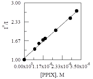We show in Figure 2 the fluorescence spectra of nanoemulsion with different concentration of PPIX As can be seen in this figure, the fluorescence intensity of nanoemulsion decreases with an increase in PPIX concentration. This observed phenomenon is consistent with molecular quenching experiments. We show in Figure 3 the ratio of the observed fluorescence intensity without, Io and with, I, of the PPIX concentration in accordance with the stern-Vollmer equation: