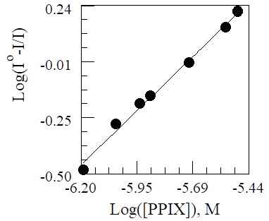 In this equation, K and Q are the binding constant and quencher, respectively, n is the binding or complexation ratio. I and Io are the fluorescence intensity with and without quencher. When the obtained fluorescence data were plotted according to this equation, a linear curve is obtained as can be seen in Figure 4.