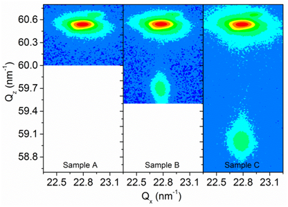 Here, B corresponds to the Bragg angle of the chosen reflection—or 0.25o in the case of x-ray reflectivity (XRR)—and the contribution of an inherent misalignment between the beam, the goniometer and the sample holder. A is the amplitude that is dependent on the angle between the surface in the case of XRR (diffraction planes in the case of XRD) and the sample holder plane on which the sample is mounted. The fitting parameters A and Y describe the vector corresponding to the normal to the measured plane from which the relative orientation of the different layers can be derived. Assuming that the sample surface is parallel to that of the sapphire substrates, for all samples, the sapphire shows a slight misalignment of ~0.34o, as shown in Table 3. In addition, the GaN 002 planes are tilted by ~0.13o from the 006 Al2O3 planes. The sum of these two values agrees well with the directly measured angle between the surface and (0001) planes of GaN. The GaN and InxGa1-xN layers are parallel to each other within experimental accuracy. The miscut analysis results are summarized in Table 3. However, no strain anisotropy is observed for these samples. Figure 4A shows PL spectra of the samples at 12K. Sample A, with 0.4% InN, exhibits only a spectral response typical of GaN, dominated by NBE emission at 357nm. Sample B, with 8.9% InN, has a prominent InGaN peak at 404nm, whereas sample C (15.8% InN) has a dominant peak at 442nm attributed to the InGaN NBE emission. In addition, spectra of both samples B and C include a small component of GaN NBE emission at 357nm.