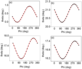 Figure 3 XRR and XRD rocking curve peak positions (symbols) and fits using equation1 (solid lines) of sample C, measured as a function of the azimuthal angle (Φ). (A) Sample surface (XRR), (B) sapphire (0001) plane (XRD), (C) GaN (0001) plane (XRD), and (D) InGaN (0001) plane (XRD). See text for details.