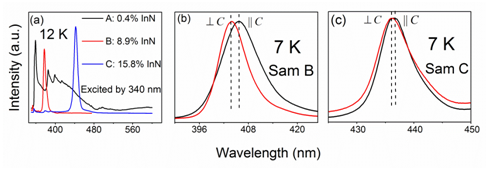 Only samples B and C were used for the purpose of polarization PL measurements to investigate if there is an energy anisotropy, since fully compressive strain is a prerequisite for the occurrence of this anisotropy. As previously discussed, sample D is relaxed due to high InN content; hence, it is not reliable for the polarization study. It has to be considered that anisotropic polarization response can be induced for certain incident angles of the polarized excitation laser.19 Therefore, we carried such polarization measurements at low temperature as shown in Figure 4B & Figure 4C. We observed an energy shift of the NBE peak in the PL spectra of samples B and C for different polarized excitation light. In both samples, there is a small, but definite, blue-shift as the polarization angle of the excitation is switched from ∥c to ⊥c. On the other hand, we carried out the polarization measurement at the same incident angle on pure GaN grown on c-sapphire (not shown) and, there was no sign of energy shift of NBE peak with different angle of the polarized excitation laser. In Figure 5A, we show the angular response of sample B PL spectra taken at the low temperature of 7K. The degree of polarization, ρ, is determined using the equation;