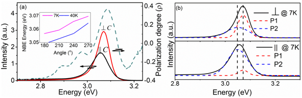 Where I^ is the PL intensity of the sample excited with the laser polarized perpendicularly to the c-axis, and I∥ is the component of the PL intensity with polarization parallel to the c-axis. The polarization degree is highly energy dependent and peaked at 3.08eV, as shown in Figure 5A, corresponding to 31% polarization. The inset gives the angular dependence of the PL peak energy at 7K and 40K, indicating absence of temperature dependence. At these temperatures, as the polarization angle is changed from 180o (∥c) to 270o (⊥c), a gradual blue-shift in the band edge peak is observed (at 7K (40 K) the peak energy value rises from 3.06eV (3.05eV) to 3.07eV (3.06eV) with the increase in the polarization angle). Although polarization selection rules necessitate that the peak of the ^c component occupies the lowest energy,26 they were contradicted in the case of our InxGa1-xN thin epilayers. With polarization parallel to the basal axes (∥c) the samples exhibited higher peak energy than for ∥c. To understand this apparent incongruence, we used multiple Gaussian components peak fitting to resolve the PL spectra of the polarization vectors parallel (^c) and perpendicular (∥c) to the basal axes, as shown in Figure 5B. Both peaks are the cumulative superposition of transitions between two VB energy states, represented by P1 and P2, but with varying intensities. The average full width at half maximum (FWHM) values for P1 and P2 of the contributing peaks were 47.1 (± 2.8) meV and 97.7 (± 5.4) meV, respectively, which suggests that the respective Gauss components are from similar emission centers of heavy and light VBs with respect to both angles. The average shift between the peaks is ~14.24 meV. A similar observation, albeit with a higher (~40meV) shift between peaks, has been reported by Sun et al.,15 for InGaN grown on m-plane in agreement with the 31% polarization degree. However, this argument is not enough to prove the anisotropy as investigating the cause of such energy shift, measuring polarization dependence on InxGa1-xN layers with growth direction along c-axis is not an easy process. Hence, for further investigation, we carried out polarization measurements on the emitted light as the function of the angle of the incident laser with respect to the c-axis. No energy anisotropy was observed for the emitted light. Therefore, such energy shifts of the different polarized light cannot be due to strain anisotropy and valance band separation. Thus, the blue-shift of the peak wavelength due to the band-tail filling effect by carries,27 and observed on m-plane. Such band filling effects can be due to fluctuations of the band gap of inhomogeneous in distribution across the sample that creates localized states.28 In this case, when the laser intensity changes due to different polarization degrees, the filling of the low energy band-tail states occurs by the carries, causing such blue-shift in the NBE peak. In summary, we have carried out structural and optical analyses on slightly miscut InGaN thin film samples. Structural analyses showed that the miscut InGaN thin epilayer was pseudomorphically strained for low in content samples with a state-of-the-art GaN-like quality. We found that polarization dependent PL of excited light showed blue-shift energy with different excitations of light polarization, which may have been induced by the slight misalignment of the InGaN layers. The polarization measurements of the emitted light should not have an energy shift, indicating that energy anisotropy did not occur for the slight tilted InGaN from c-axis. Thus, we conclude that the blue-shift of the NBE emission with polarization is due to the band filling effect.