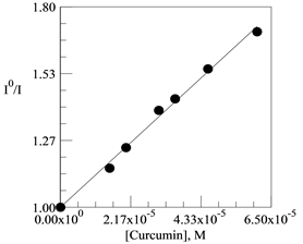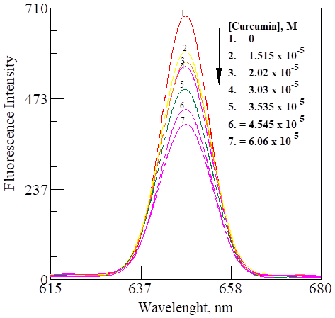 1.135 x 10-4 M hemoglobin and 3.7875 x 10.4 M curcumin stock solutions were prepared in 25 mL and 10 mL, volumetric flasks, respectively, using the prepared nanoemulsion. From these, a volume of 3.0 mL of nanoemulsion solution were added to 7 5.0 mL volumetric flasks. Into the first flask, 1 mL of hemoglobin solution was added and swilled for a thorough mixing. Thereafter, aliquot volumes of 0.2, 0.3, 0.4. 0.5 0. 0.6 and 0.8 mL of curcumin solution were gently and carefully added to flasks 2-7. These solutions were diluted to the fiduciary mark of the flasks with the nanoemulsion solution. The final concentration of hemoglobin was 2.27 x 10-5 M and that of curcumin varied from 1.515 x 10-5 M to 6.06 x 10-5 M. The fluorescence measurement of these solutions was made in a 4-sided quarts cuvette. The excitation wavelength was kept constant at 325 nm and the emission wavelength was observed at 647 nm.
